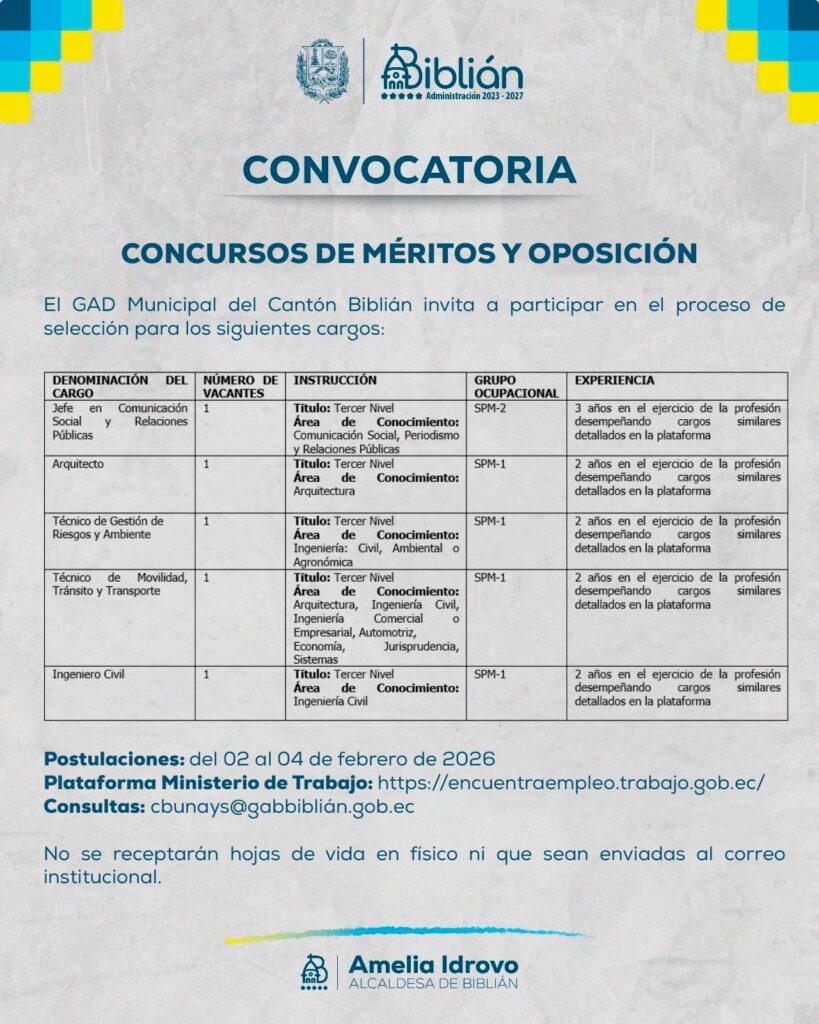 CONVOCATORIA A CONCURSOS DE MÉRITOS Y OPOSICIÓN Start 2 febrero, 2026 7:00 am End 4 febrero, 2026 11:00 pm